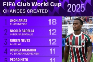 去豪门?世俱杯创造机会榜:琼-阿里亚斯18次,巴雷拉&内维斯12次